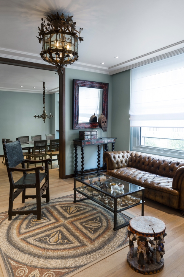 Cet appartement est destiné à une collectionneuse. Construit en 1931 dans le courant du mouvement de l’école de Paris, l'édifice présente toutes les caractéristiques de l’immeuble bourgeois. La distribution de l'appartement respecte la séparation entre les espaces de réception, l’habitation privée et les espaces dévolus au service. Cette configuration est préservée, les modifications spatiales apportées sont succinctes et créent un cadre mettant en relation les différentes collections de mobilier et d'objets d'art.